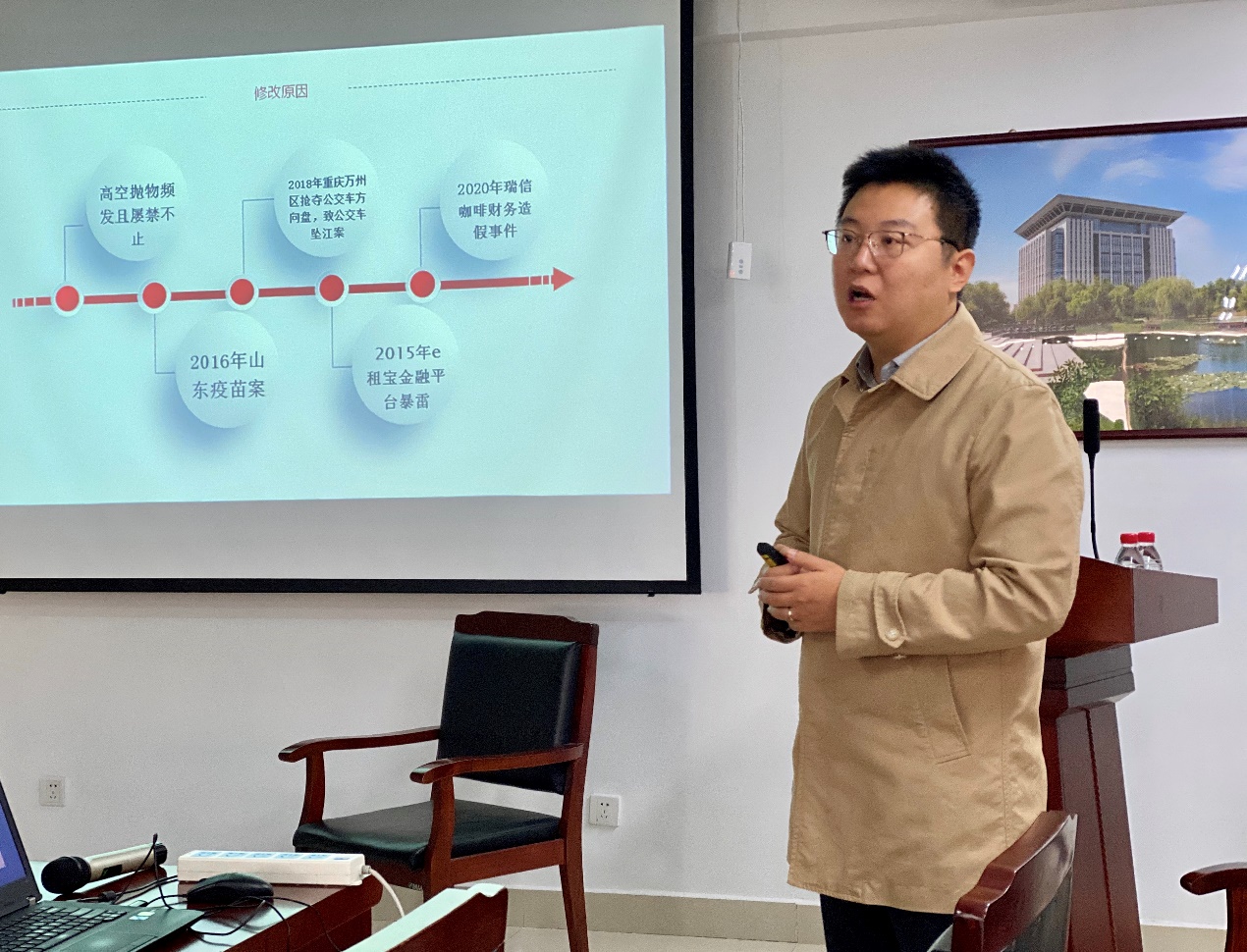 《刑法修正案(十一)草案》适应新时代人民群众日益增长的美好生活需要,聚焦近年来社会生活领域出现的、人民群众普遍关心的重要问题,加强保护人民群众生命财产安全,特别是有关安全生产、食品药品、环境、公共卫生等涉及公共、民生领域的基本安全、重大安全。论坛第一单元是由介绍人向各位参会教师汇报《刑法修正案(十一)草案》修法的主要内容。首先,由黄辰博士对涉及“安全生产犯罪”、“食品药品犯罪”、“破坏金融秩序犯罪”的修改内容进行介绍。