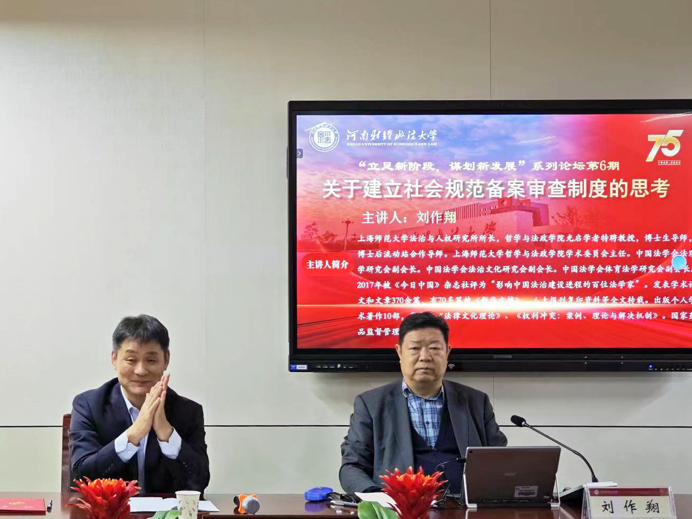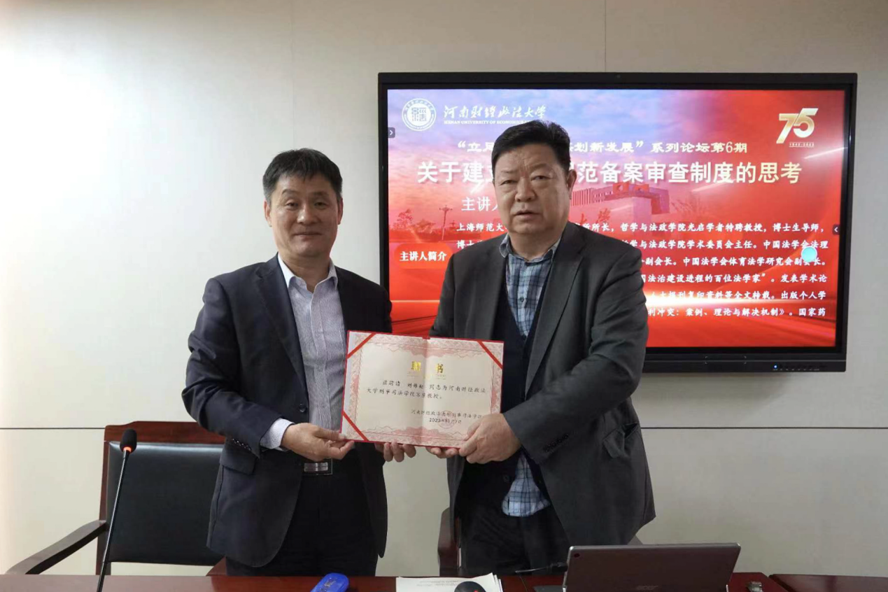 2023年11月7日晚19点,“立足新阶段,谋划新发展”高层论坛第6期在郑东校区举办。bevictor伟德邀请知名学者上海师范大学法治与人权研究所所长,哲学与法政学院光启学者特聘教授,博士生导师,博士后流动站合作导师刘作翔教授作《关于建立社会规范备案审查制度的思考》的学术讲座。讲座由bevictor伟德院长姜保忠教授主持。讲座开始之前,姜保忠院长为刘作翔教授颁发了客座教授聘书。