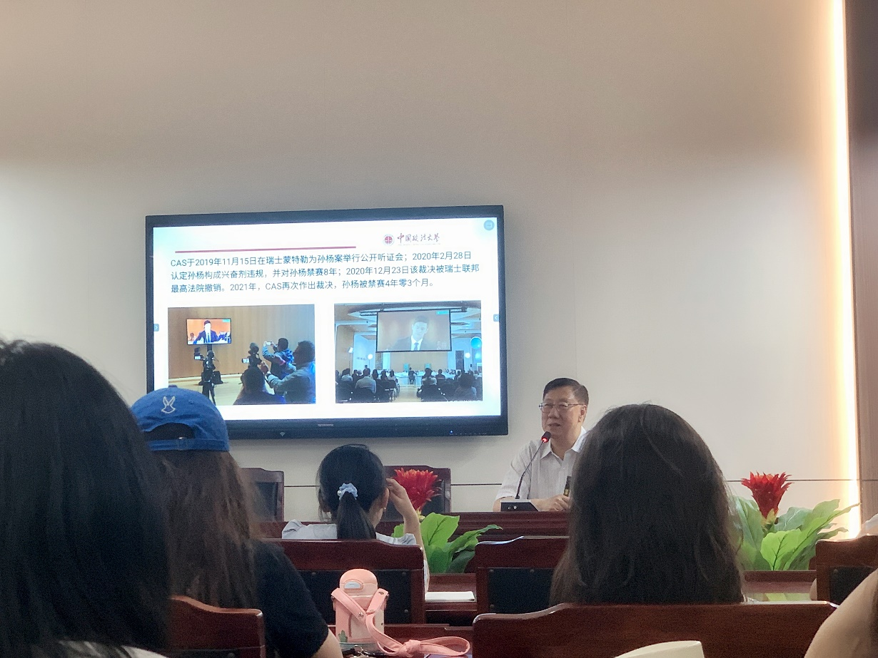 马宏俊教授以“从孙杨案看国际国内反兴奋剂法律规则的适用”为题,说明体育仲裁制度的重要性,并结合孙杨案进行了详尽的阐释。马宏俊教授分析了体育仲裁法的主要特点,从比较视角介绍了国内法、国际法的具体适用情况,重点解析了规则适用、仲裁主体资格等问题。同时,他还就如何形成专业的法律思维同现场师生展开了热烈的讨论。
