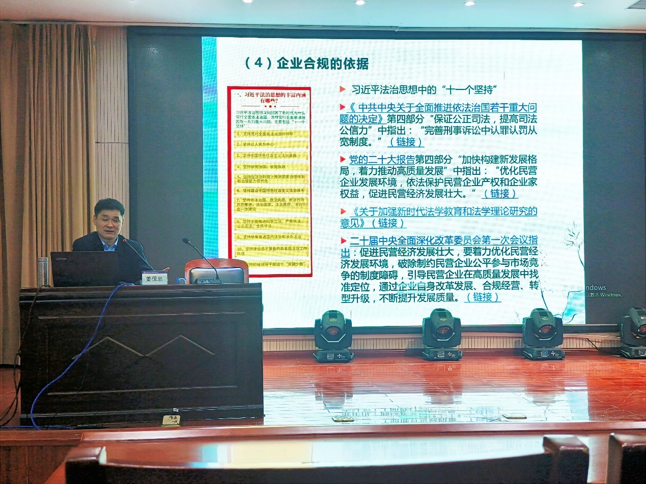 姜保忠以“最高检企业合规典型案例解读与相关理论问题研究”为题进行授课。姜保忠指出,2020年3月,最高人民检察院部署在全国6个基层检察院开展涉案企业合规改革试点。2021年3月,最高人民检察院在总结第一批试点经验的基础上,在全国10个省份449个检察院开展第二批试点工作。自2022年4月起,涉案企业合规改革在全国检察机关全面推开。涉案企业合规改革是打造法治化营商环境,健全企业内部治理机构,推进社会治理体系和治理能力现代化的重要举措,是强化检察机关法律监督职能的重要途径。目前,涉案企业合规改革已经从审查起诉阶段扩展到刑事诉讼的全流程,成为司法机关的一项重要工作。