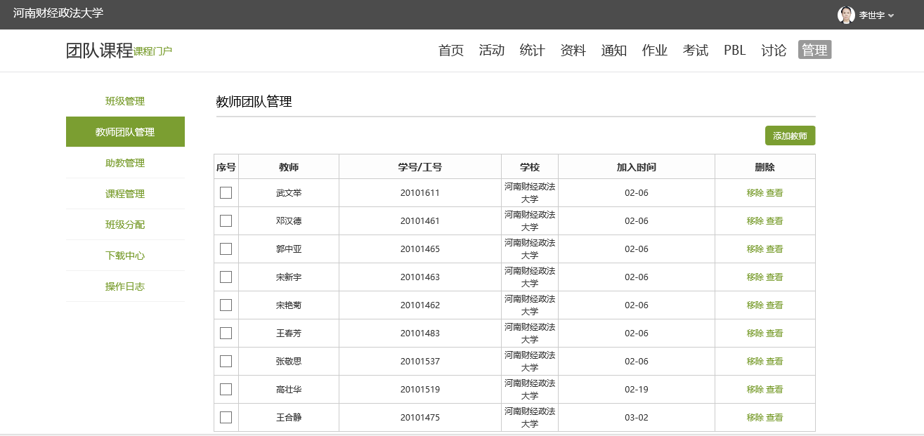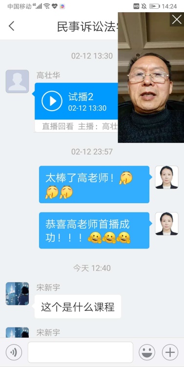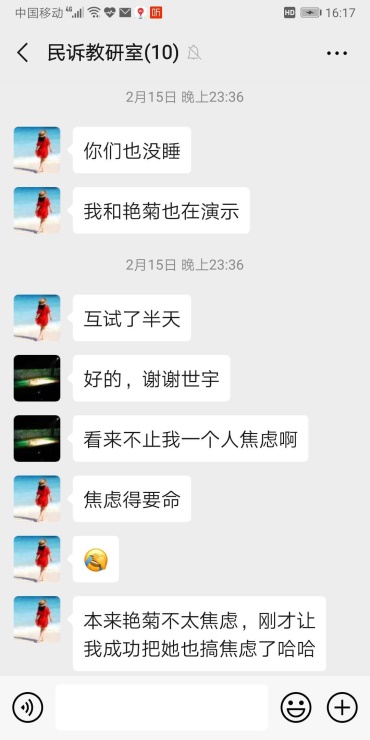 民事诉讼法教研室李世宇主任,针对网上教学平台资源不仅其本人善于探索问题,积极与学校教师教学发展中心平台进行网上教学交流学习,而且带领本教研室克服年龄大,不主动动手操作实际情况,建立教学团队,从早期全教研室集体失眠,焦虑无助,到后面一点点摸索,到第一次试播的集体欢呼,更有在超星课程端终于和学生联系上的喜极而泣。