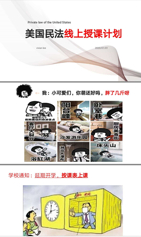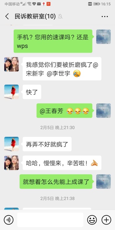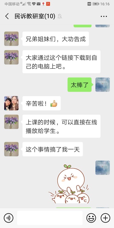 民诉教研室制订多种方案,尝试各种在线教学方法,总结各种方式的不足和优点,仅录制课程就尝试了5种以上软件。为了防止网络等因素造成教学风险,老师们集体攻克难题,在爱课程、中国大学慕课等网站分头搜索国家级精品课程,进行精心比较甄选,选用与马工程教材以及本校民诉法课程最贴近的南京师范大学慕课资源作为备选方案,为了方便学生学习,将慕课资源全部下载,设置在所有任课教师的超星课程资料里,供学生作为学习参考资源。保证了在线教学的稳健推进,确保零风险,争取在线课程的零失误!
