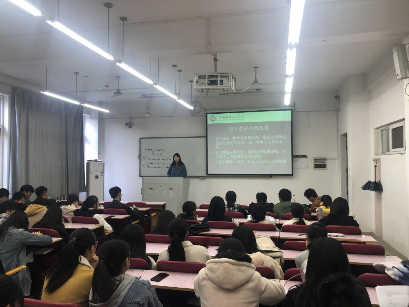 会议期间,靳倪妍结合宗教知识竞赛题目向在座学生详细地讲解了有关宗教的具体知识,以此来帮助学生们加深对宗教知识的了解。她认为,宗教知识的学习对于大学新生的意义重大,希望在座学生能够认真学习,提高辨别意识,树立正确的宗教观念。